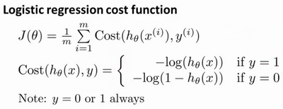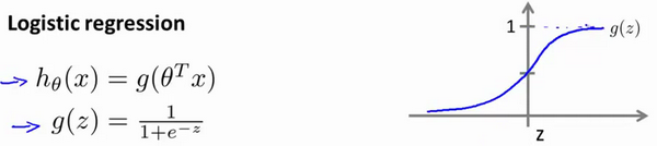 顺便说一下,逻辑回归算法是分类算法,我们将它作为分类算法使用。有时候可能因为这个算法的名字中出现了“回归”使你感到困惑,但逻辑回归算法实际上是一种分类算法,它适用于标签 取值离散的情况,如:1 0 0 1。