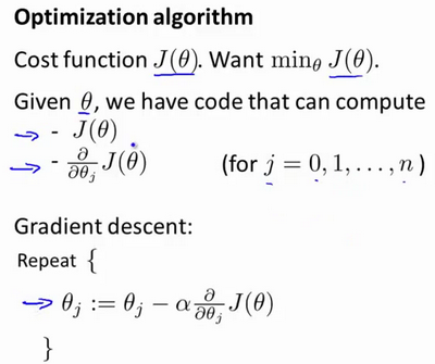 在上一个视频中,我们讨论了用梯度下降的方法最小化逻辑回归中代价函数。在本次视频中,我会教你们一些高级优化算法和一些高级的优化概念,利用这些方法,我们就能够使通过梯度下降,进行逻辑回归的速度大大提高,而这也将使算法更加适合解决大型的机器学习问题,比如,我们有数目庞大的特征量。现在我们换个角度来看什么是梯度下降,我们有个代价函数,而我们想要使其最小化,那么我们需要做的是编写代码,当输入参数 时,它们会计算出两样东西: 以及 等于 0、1 直到 时的偏导数项。