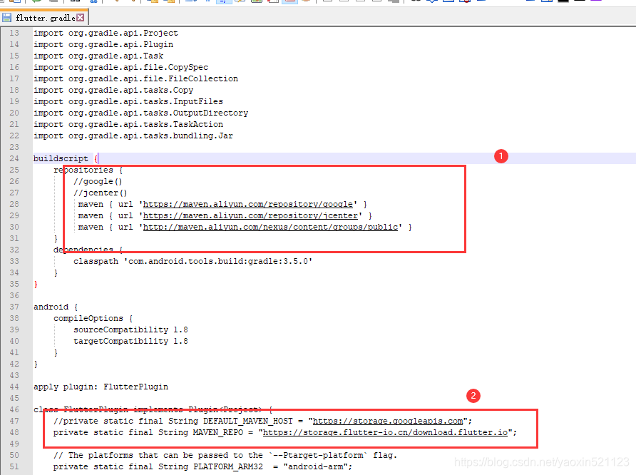 - 修改Flutter的配置文件, 该文件在Flutter安装目录/packages/flutter_tools/gradle/flutter.gradle