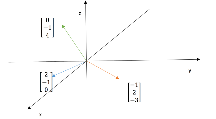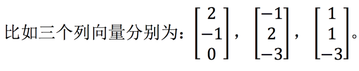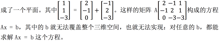 另外,还要注意的一点是对任意的 b 是不是都能求解 Ax = b 这个矩阵方程呢?也就是对 3*3 的系数矩阵 A,其列的线性组合是不是都可以覆盖整个三维空间呢?对于我们举的这个例子来说,一定可以,还有我们上面 2*2 的那个例子,也可以 覆盖整个平面,但是有一些矩阵就是不行的,比如三个列向量本身就构成了一个 平面,那么这样的三个向量组合成的向量只能活动在这个平面上,肯定无法覆盖 2 −1 1 一个三维空间,