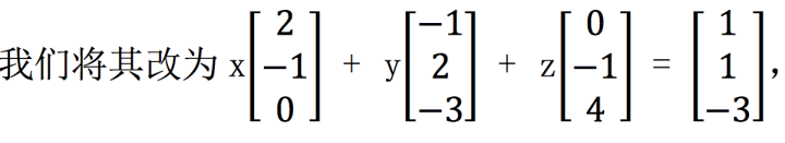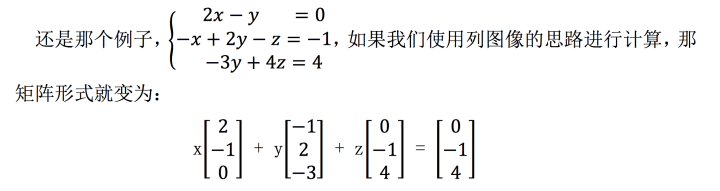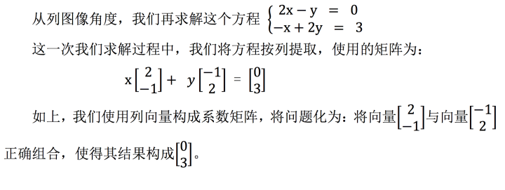 当然,之所以我们更推荐使用列图像求解方程, 是因为这是一种更系统的求解方法,即寻找线性组合,而不用绘制每个行方程的 图像之后寻找那个很难看出来的点。