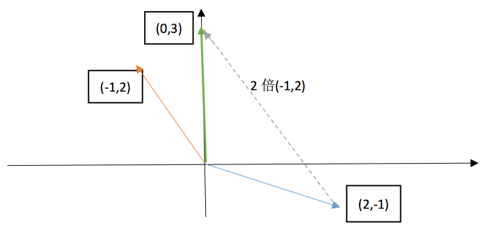 即寻找合适的 x,y 使得 x 倍的(2,-1) + y 倍的(-1,2)得到最终的向量(0,3)。在很 明显能看出来,1 倍(2,-1) + 2 倍(-1,2)即满足条件。反映在图像上,明显结果正确。