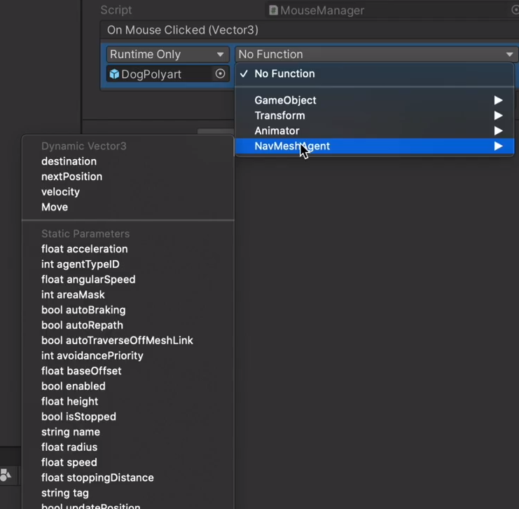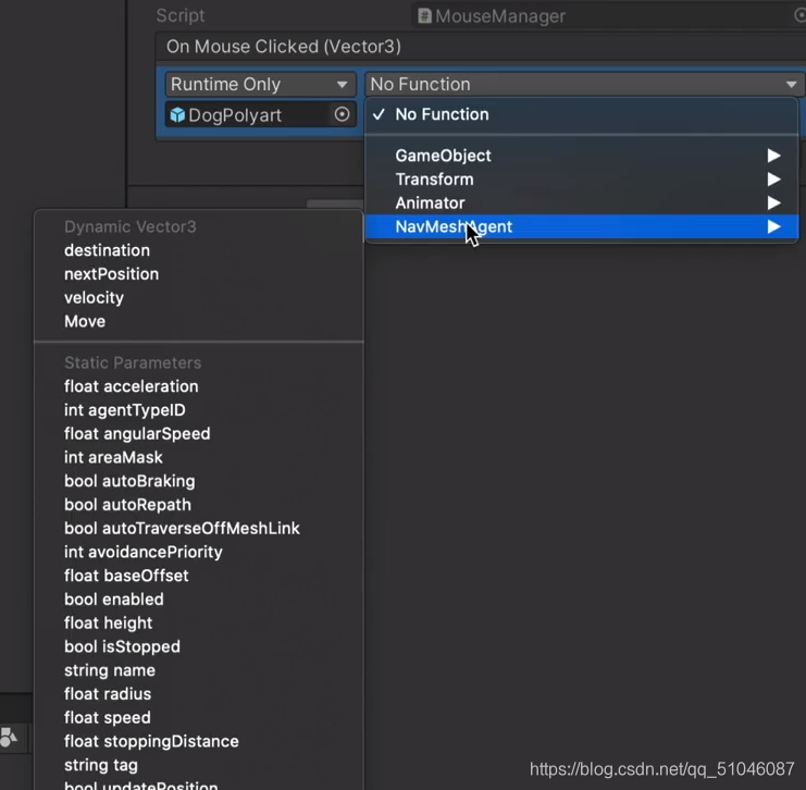 这是要将物体的Nav Mesh Agent 放入脚本的事件中,且选定NavMeshAgent中的destion