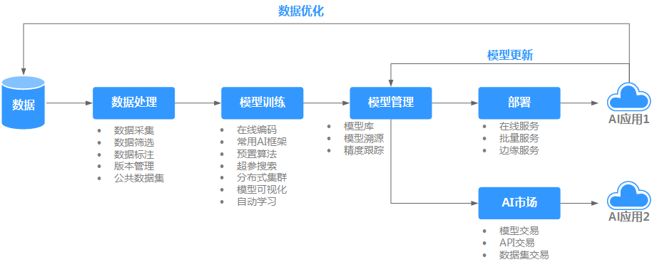 ModelArts是一个一站式的开发平台,能够支撑开发者从数据到AI应用的全流程开发过程。包含数据处理、模型训练、模型管理、部署等操作,并且提供AI市场功能,能够在市场内与其他开发者分享模型、API和数据集。