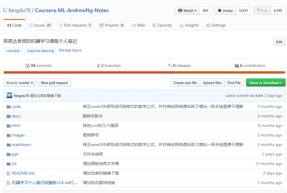吴恩达老师的机器学习课程,可以说是机器学习入门的第一课和最热门课程,我在github开源了吴恩达机器学习个人笔记,用python复现了课程作业,成为热门项目,star数达到11671+,曾经有相关报道文章。科学无国界,但科学家有国界,导致github下载速度较慢,国内用户很难下载github上的资源,于是我将陆续把我的github仓库打包成镜像文件,放到百度云提供下载,5秒即可保存。(黄海广)