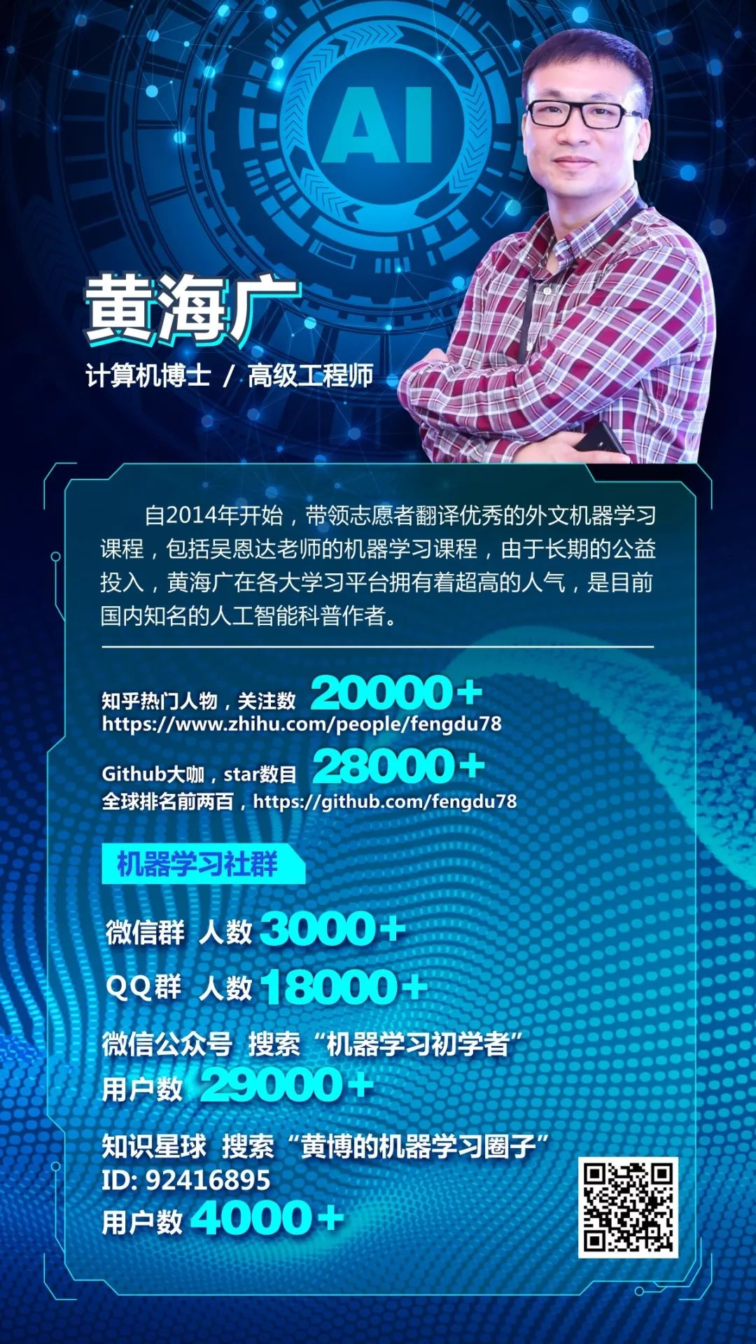 “机器学习初学者”是帮助人工智能爱好者入门的个人公众号(创始人:黄海广)