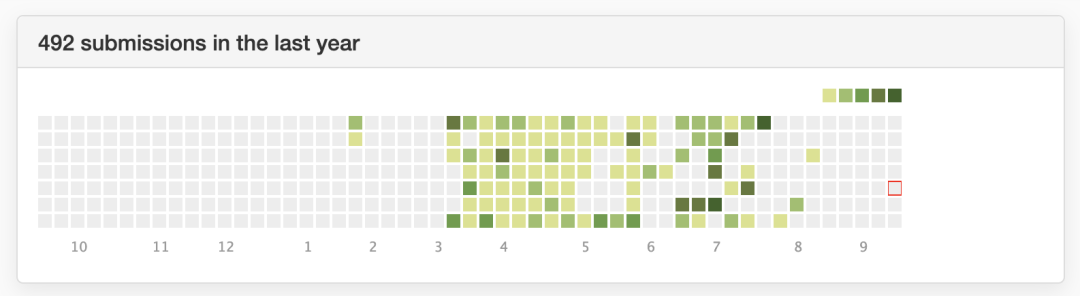 针对硬算法,我从三月份开始,基本每天坚持做一道 leetcode 算法题。以下是我的提交记录,每个格子代表一天,颜色越深,表示刷题数目越多,时间跨度是三月份到七月底。