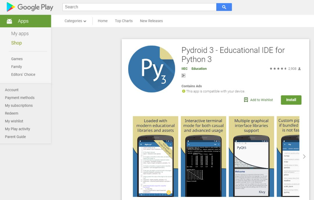 我们可以从google play 或者应用汇上面找到Pydroid 3,下载安装即可。由于使用google play 不方便,小编最后选择了应用汇进行下载,点击图标就可以开始使用啦,根据自己的需要可以选择pip各种库哦!结合手机浏览器,你还可以在安卓上拥有Jupyter notebook!快去下载试试吧!