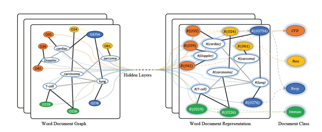 Yao等人提出了一种基于graph convolutional networks(GCN)进行文本分类。作者构建了一个包含word节点和document节点的大型异构文本图,显式地对全局word利用co-occurrence信息进行建模,然后将文本分类问题看作是node分类问题。