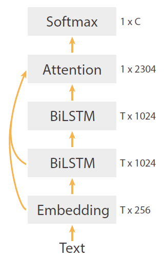 DeepMoji模型首先使用embedding层将单词映射成向量,并将每个embedding维度使用双正切函数映射到[-1,1]。然后,作者使用两层的Bi-LSTM捕捉上下文特征。接着作者提出了一种新的注意力机制,分别将embeddding层以及2层的Bi-LSTM作为输入,得到文档的向量表征。最后,将向量输入到softmax层,得到标签的概率分布。