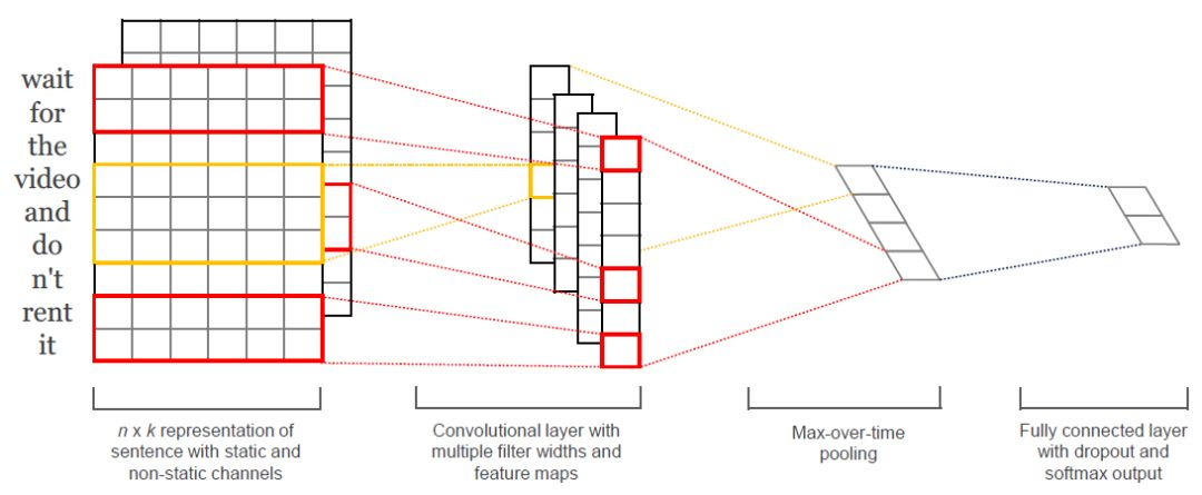 Kim在EMNLP2014提出的TextCNN方法,在多个数据集上取得了很好的效果。由于其计算速度快以及可并行性,在产业界得到了广泛使用。TextCNN的模型示意图如下图所示。