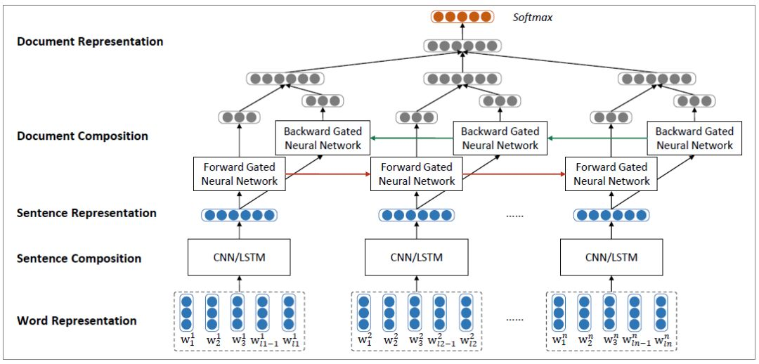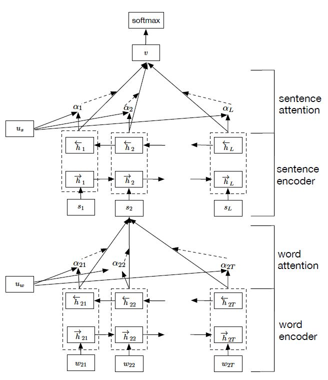 Yang等人提出了一种用于文档分类的层次注意力机制网络,简称HAN。这篇文章和Tang等人都是针对于文档分类的问题,然而,这篇文章在句子级别以及文档级别提出了注意力机制,使得模型在构建文档时是能够赋予重要内容不同的权重,同时,也可以缓解RNN在捕捉文档的序列信息产生的梯度消失问题。HAN模型的模型示意图如下所示。