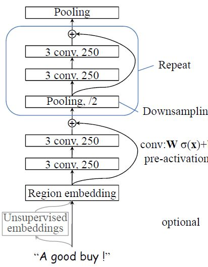 然后是卷积快的叠加(两个卷积层和一个shortcut连接,其中shortcut连接类似于残差连接),与步长为2的最大池化层进行下采样。最后使用一个最大池化层,得到每个文档的文档向量。