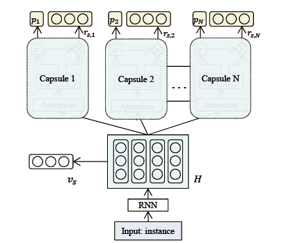 RNN-Capsule首先使用RNN捕捉文本上下文信息,然后将其输入到capsule结构中,该capsule结构一共由三部分组成:representation module, probability module,和reconstruction module。具体地,首先用注意力机制计算capsule 表征;然后用capsule表征计算capsule状态的概率;最后用capsule表征以及capsule状态概率重构实例的表征。