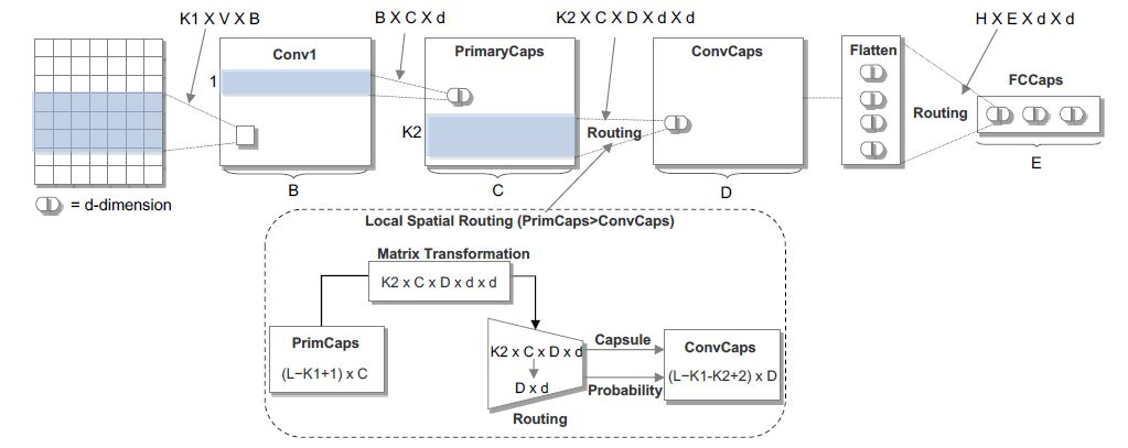 Zhao等人提出了一种基于胶囊网络的文本分类模型,并改进了Sabour等人提出的动态路由,提出了三种稳定动态路由。模型如下所示: