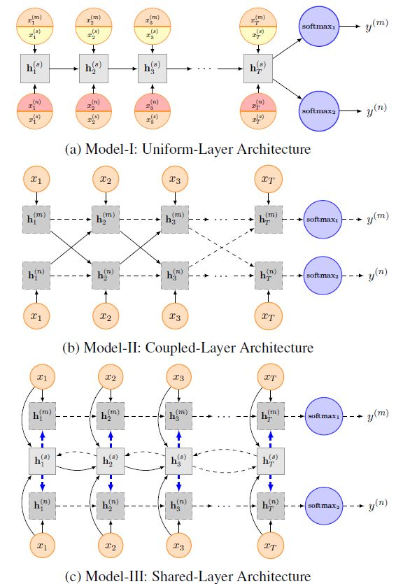 Liu等人针对文本多分类任务,提出了基于RNN的三种不同的共享信息机制对具有特定任务和文本进行建模。