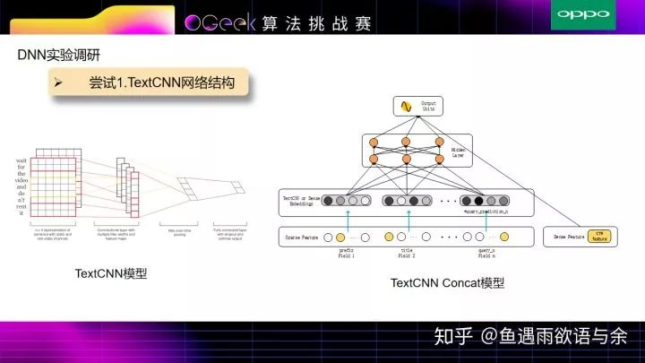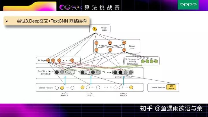 具体流程如下: 输入分为两部分,对于prefix,title和query_prediction进行TextCNN操作提取文本特征,tag和统计特征通过全连接层获取对应的Embedding特征。
