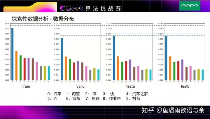 这四个图是prefix在各自数据集的百分比统计,并以训练集中出现频次top10的prefix画出了每个数据集的占比情况,可以发现valid与testa和testb的分布相似,说明valid与testa和testb的查询时间比较接近,作为验证集线下比较可信。