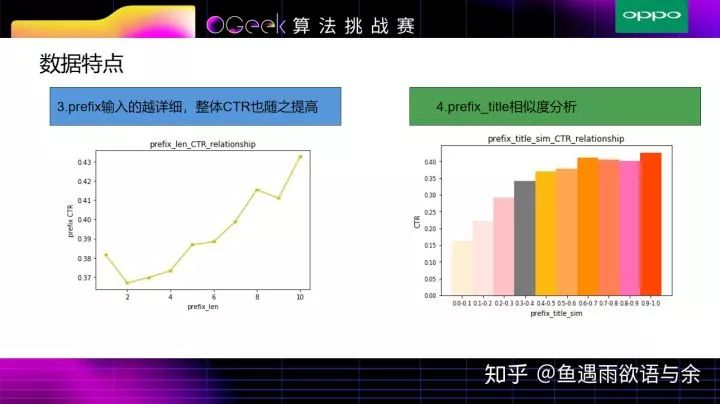 除基础数据分析外,我们还分析了部分特征,比如prefix的长度特征,其用户输入prefix越详细,整体CTR也随之提高,其他特征的长度也有类似的趋势。