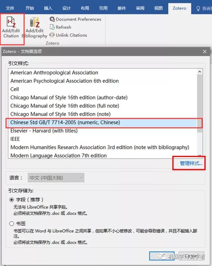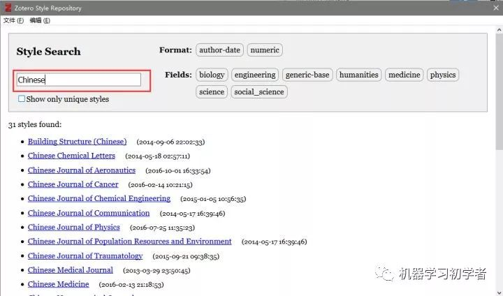 Citation工具→选择右下角管理样式→在 Zotero Style Repository对话框寻找想要的引文格式