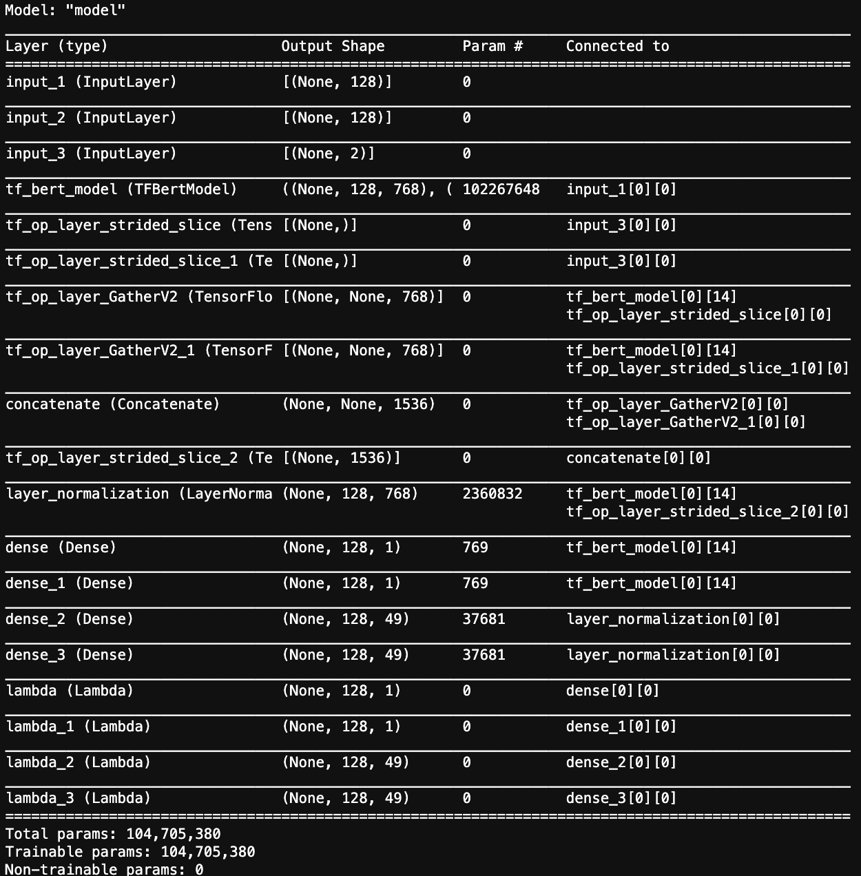 def extract_subject(inputs):"""根据subject_ids从output中取出subject的向量表征"""output, subject_ids = inputsstart = tf.gather(output,subject_ids[:,0],axis=1,batch_dims=0)end = tf.gather(output,subject_ids[:,1],axis=1,batch_dims=0)subject = tf.keras.layers.Concatenate(axis=2)([start, end])return subject[:,0]'''output.shape = (None,128,768)subjudec_ids.shape = (None,2)start.shape = (None,None,768)subject.shape = (None,None,1536)subject[:,0].shape = (None,1536)这一部分给出各个变量的shape应该一目了然'''def build_model_2(pretrained_path,config,MAX_LEN,p2id):ids = tf.keras.layers.Input((MAX_LEN,), dtype=tf.int32)att = tf.keras.layers.Input((MAX_LEN,), dtype=tf.int32)s_po_index = tf.keras.layers.Input((2,), dtype=tf.int32)config.output_hidden_states = Truebert_model = TFBertModel.from_pretrained(pretrained_path,config=config,from_pt=True)x, _, hidden_states = bert_model(ids,attention_mask=att)layer_1 = hidden_states[-1]start_logits = tf.keras.layers.Dense(1,activation = 'sigmoid')(layer_1)start_logits = tf.keras.layers.Lambda(lambda x: x**2)(start_logits)end_logits = tf.keras.layers.Dense(1,activation = 'sigmoid')(layer_1)end_logits = tf.keras.layers.Lambda(lambda x: x**2)(end_logits)subject_1 = extract_subject([layer_1,s_po_index])Normalization_1 = LayerNormalization(conditional=True)([layer_1, subject_1])op_out_put_start = tf.keras.layers.Dense(len(p2id),activation = 'sigmoid')(Normalization_1)op_out_put_start = tf.keras.layers.Lambda(lambda x: x**4)(op_out_put_start)op_out_put_end = tf.keras.layers.Dense(len(p2id),activation = 'sigmoid')(Normalization_1)op_out_put_end = tf.keras.layers.Lambda(lambda x: x**4)(op_out_put_end)model = tf.keras.models.Model(inputs=[ids,att,s_po_index], outputs=[start_logits,end_logits,op_out_put_start,op_out_put_end])model_2 = tf.keras.models.Model(inputs=[ids,att], outputs=[start_logits,end_logits])model_3 = tf.keras.models.Model(inputs=[ids,att,s_po_index], outputs=[op_out_put_start,op_out_put_end])return model,model_2,model_3