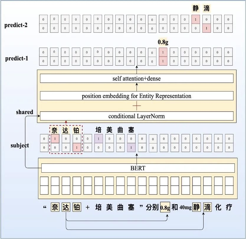 该任务本来应该分成两个模块完成:1.抽取实体(包括S和O)2.判断实体之间的关系,理应至少需要两个模型协同完成,但苏神将实体之间的关系类别预测隐性的放在了O抽取的过程中,即让模型在预测O的时候直接预测O与S的关系P。