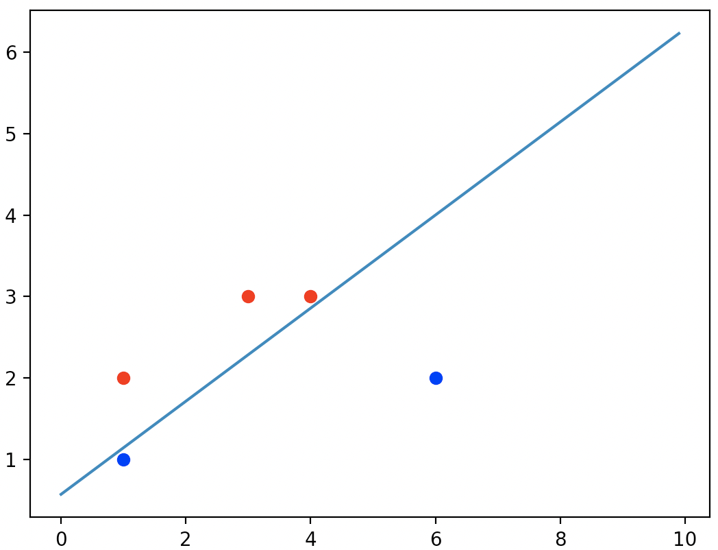 import matplotlib.pyplot as pltclass Perceptron_orginal:def __init__(self,n=1,max_iter=10):self.rate = nself.max_iter = max_iterdef fit(self,X,Y):X = np.array(X)Y = np.array(Y)self.feature_num = len(X[0])self.w = np.zeros(self.feature_num)self.b = 0self.iter = 0while bool(1-(self.predict(X) == Y).all()):for i,j in zip(X,Y):result = self.predict(i)*jif result >0:continueelse:self.w += i*j*self.rateself.b += j*self.rateself.iter += 1if self.iter >= self.max_iter:print('cant not completely delieve the data')breakprint('training complete')passdef predict(self,X):return np.sign(np.sum(self.w * X, -1) + self.b)def main():p1 = Perceptron_orginal(0.5,20)x = [[3,3],[4,3],[1,1],[1,2],[6,2]]y = [1,1,-1,1,-1]p1.fit(x,y)print(p1.predict(x))print(p1.w)print(p1.b)positive_ = np.array(x)[np.array(y) == 1]negetive_ = np.array(x)[np.array(y) == -1]plt.scatter([k[0] for k in positive_],[k[1] for k in positive_],c='r',label='1')plt.scatter([k[0] for k in negetive_], [k[1] for k in negetive_],c='b',label='0')x_ = np.arange(0, 10, 0.1)y_ = -(p1.w[0] * x_ + p1.b) / p1.w[1]plt.plot(x_, y_)plt.show()if __name__ == '__main__':main()