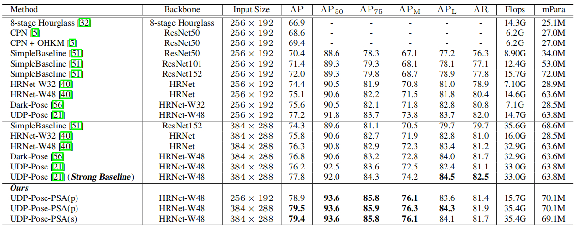 在MS-COCO keypoint数据集上,PSA基于UDP-Pose结构,提升了1.7个点的性能,达到了79.5 AP的新SOTA性能。