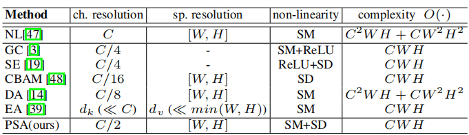 如上表所示,相比于其他注意力的方法,本文在空间维度和通道维度都没有进行很大程度的压缩(在空间维度上保持[H,W]的大小,在通道维度上使用了C/2的大小),并将复杂度也保持在了一个比较小的水平(CWH)。