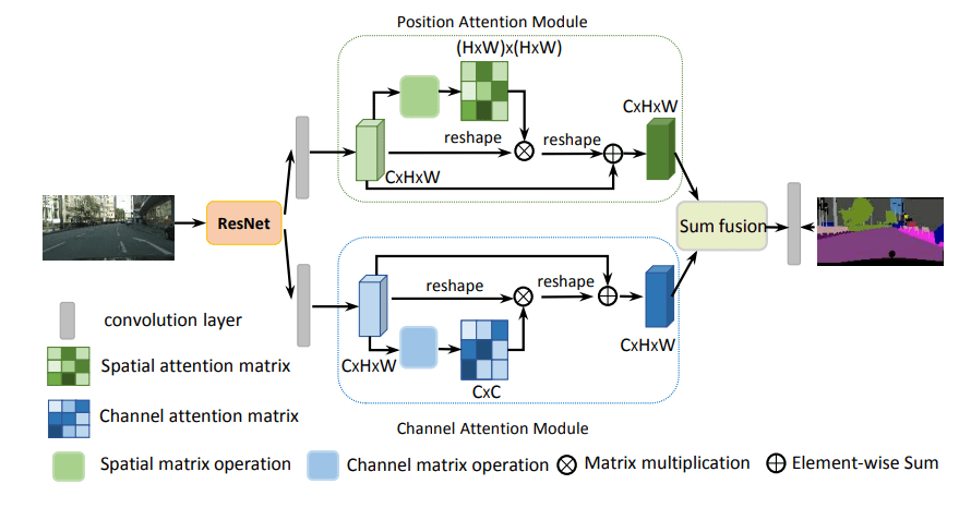 另外[5]这篇文章也是借鉴了Self-Attention的结构(网络结构如下图所示),也是在空间和通道两个维度上建模,也是用在分割任务上,有兴趣的同学也可以比较一下两篇文章的异同点。