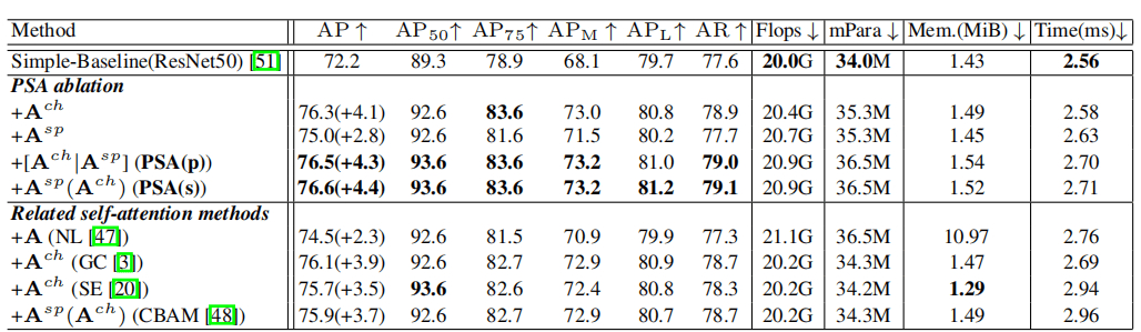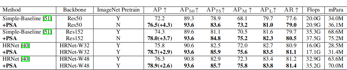 在人体姿态估计任务上,通过少量计算开销和参数数量,PSA在所有baseline网络上能够增加2.6到4.3 AP。