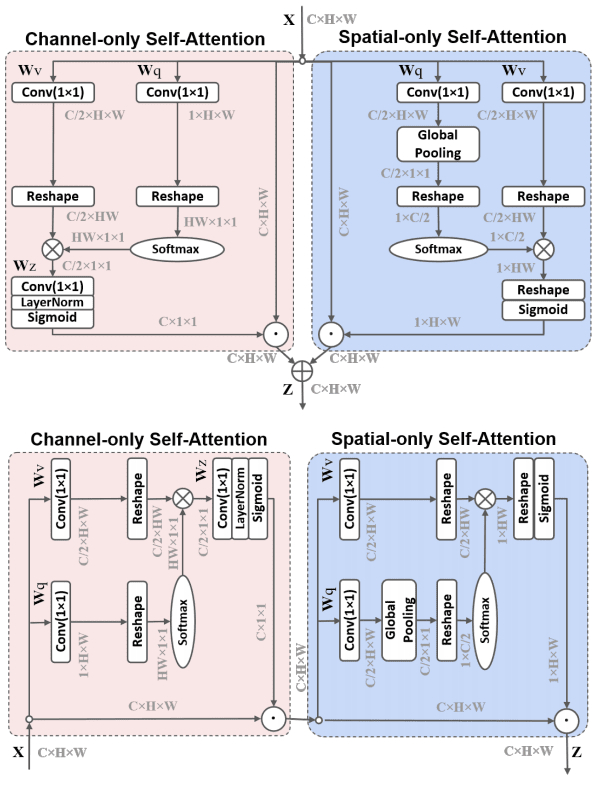 1)极化滤波( Polarized filtering):在通道和空间维度保持比较高的resolution(在通道上保持C/2的维度,在空间上保持[H,W]的维度 ),这一步能够减少降维度造成的信息损失;