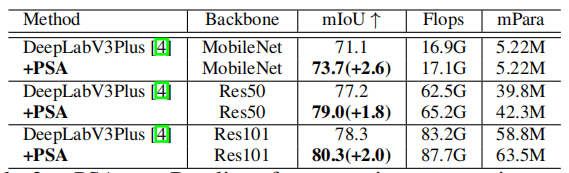在语义分割任务上,通过少量计算开销和参数数量,PSA在所有baseline网络上能够增加1.8到2.6 mIoU。