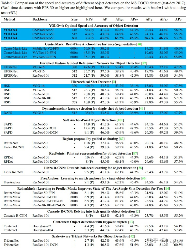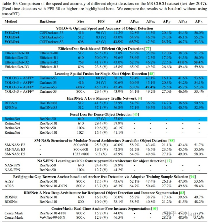 Weighted-Residual-Connections(WRC), Cross-Stage-Partial-connections(CSP), Cross mini-Batch Normalization(CmBN), Self-adversarial-training(SAT),Mish-activation Mosaic data augmentation, DropBlock, CIoU等组合得到了爆炸性的YOLOv4,可以吊打一切的YOLOv4.在MS-COCO数据上:43.5%@AP(65.7%@AP50)同时可以达到65fps@TeslaV100.