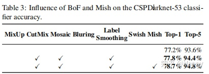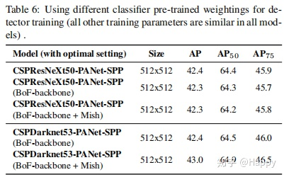 一句话就是:选择具有更大感受野、更大参数的模型作为backbone。下图给出了不同backbone的上述信息对比。从中可以看到:CSPResNeXt50仅仅包含16个卷积层,其感受野为425x425,包含20.6M参数;而CSPDarkNet53包含29个卷积层,725x725的感受野,27.6M参数。这从理论与实验角度表明:CSPDarkNet53更适合作为检测模型的Backbone。
