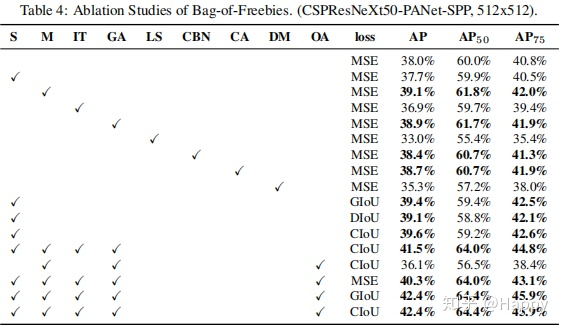 - Tricks(detector):CIoU、CMBN、DropBlock、Mosaic、SAT、Eliminate grid sensitivity、Multiple Anchor、Cosine Annealing scheduler、Random training shape
