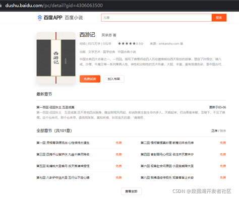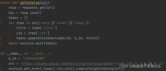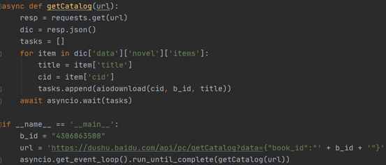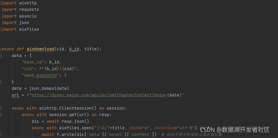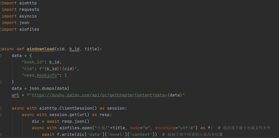 下面进行小说内容爬取,小说内容较多,我们使用异步协程的方式进行爬取,通过book_id、c_id进行传参,可通过修改book_id即可爬取百度小说中其他小说的内容。