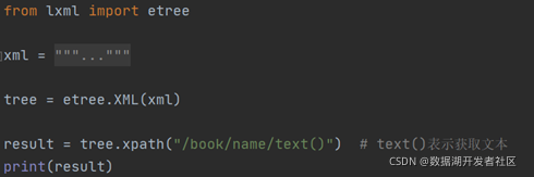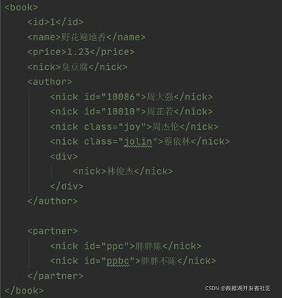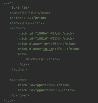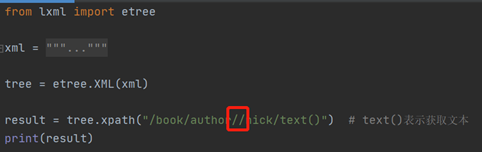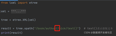 4. 获取author节点下所有的nick节点的文本,示例中存在author节点下的nick节点以及author节点下div中的nick节点,下面将全部内容进行输出。