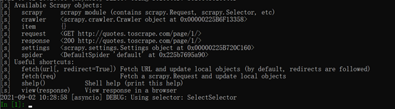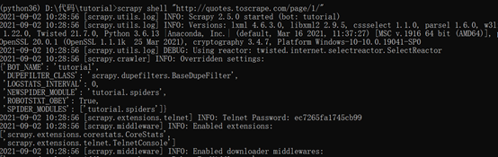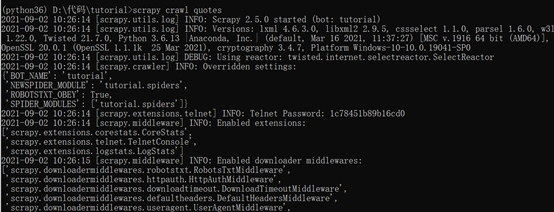 运行创建的sipder,此命令运行我们刚刚添加的spider quotes,这将发送一些 quotes.toscrape.com 领域。您将得到类似于以下内容的输出: