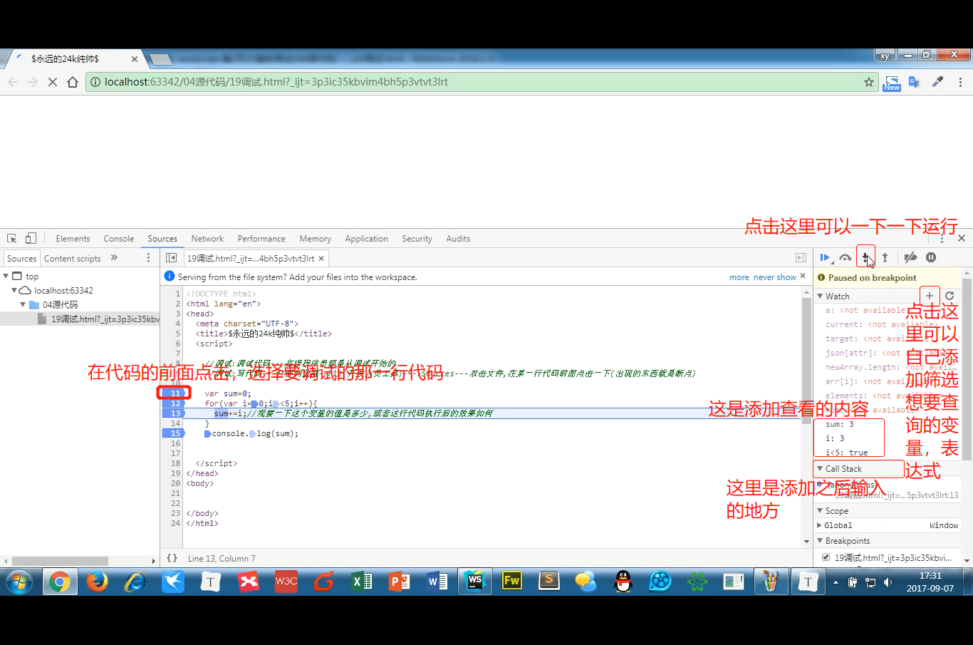 写代码--打开浏览器--F12(开发人员工具)--Sources--双击文件,在某一行代码前面点击一下(出现的东西就是断点)