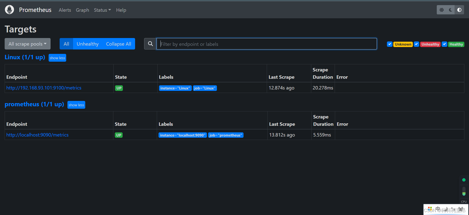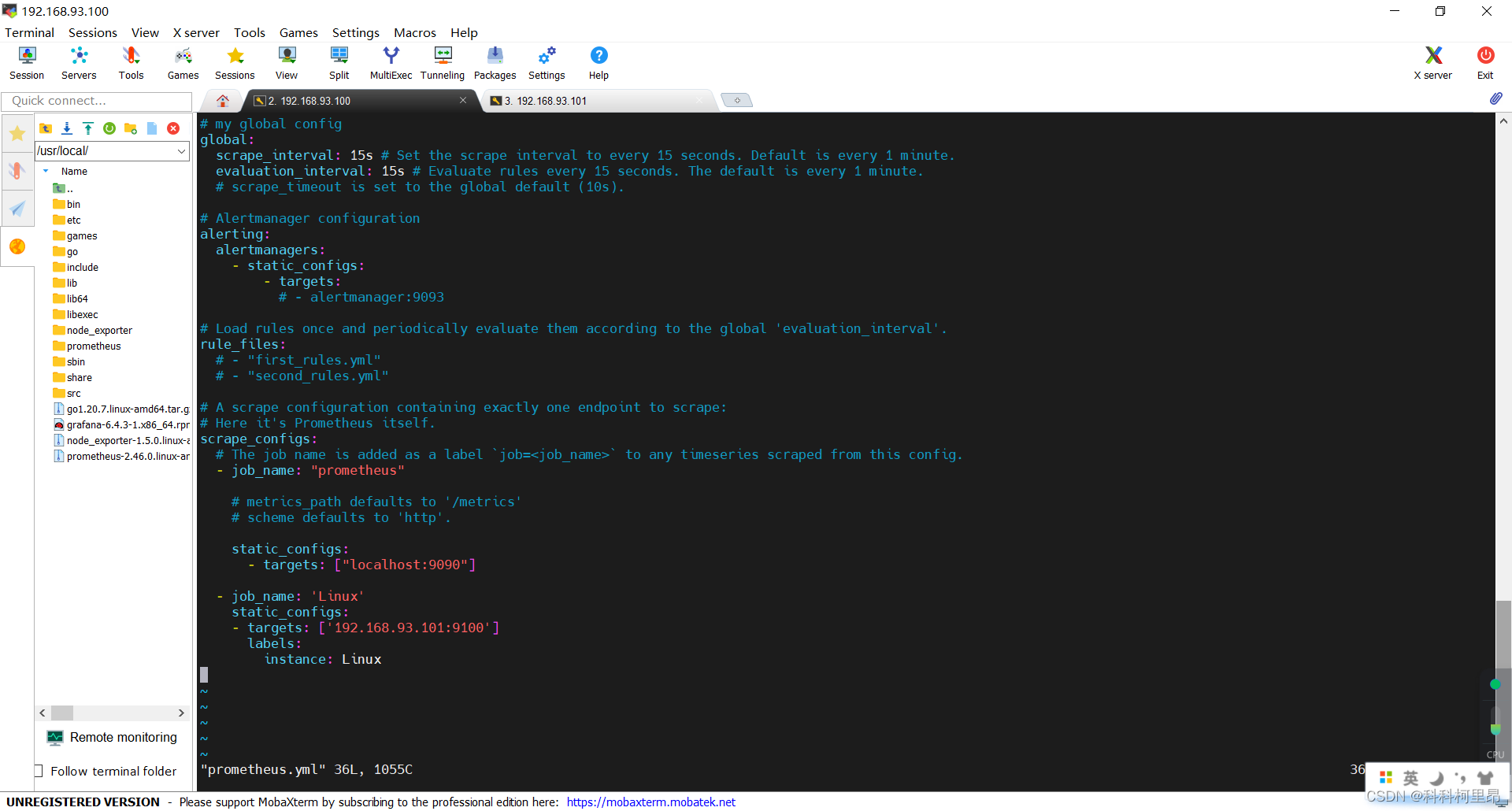 - job_name: 'Linux'static_configs:- targets: ['192.168.93.101:9100']labels:instance: Linux