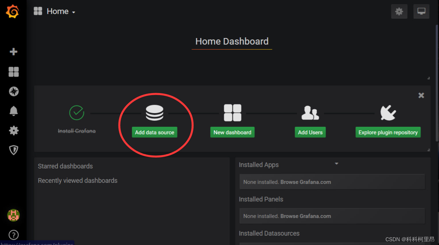 浏览器访问http://192.168.93.100:3000(IP:3000端口),即可打开grafana页面,默认用户名密码都是admin,初次登录会要求修改默认的登录密码,建议还是admin,点击主界面的“Add data source”