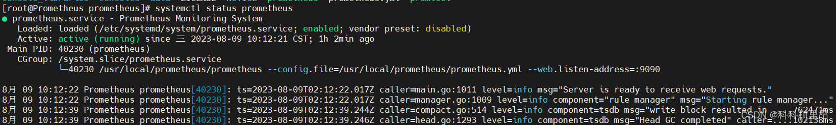 ● node_exporter.service - node_exporterLoaded: loaded (/etc/systemd/system/node_exporter.service; enabled; vendor preset: disabled)Active: active (running) since 三 2023-08-09 18:20:33 CST; 3s agoMain PID: 8246 (node_exporter)CGroup: /system.slice/node_exporter.service└─8246 /usr/local/node_exporter/node_exporter