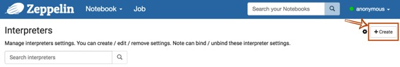 我们新建一个JDBC的解释器,首先,+ Create在解释器设置页面的右上角单击按钮。