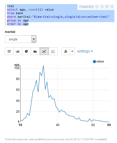 数据可视化 指令、代码提交后Zeppelin返回结果给用户,如果是结构化的数据,Zeppelin提供可视化机制,通过各类图表展示数据,十分方便。