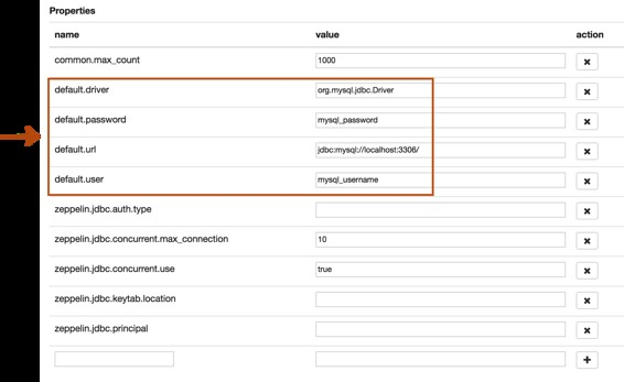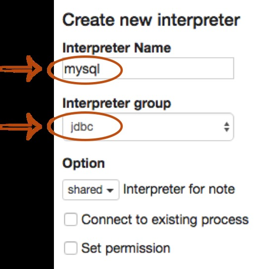 Interpreter name用任何你想要用作别名的填充字段(如mysql,mysql2,hive,redshift等)。请注意,此别名将用于%interpreter_name在段落中调用解释器。然后选择jdbc为Interpreter group。