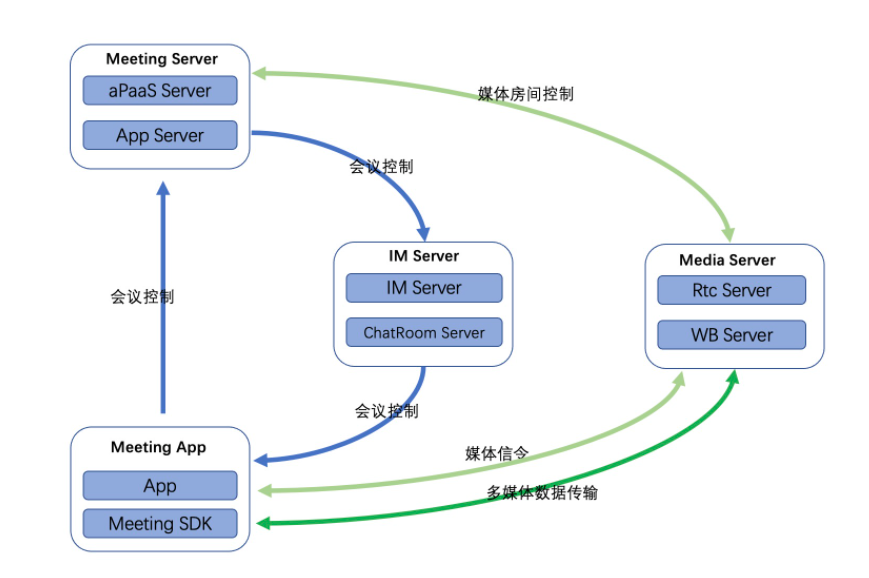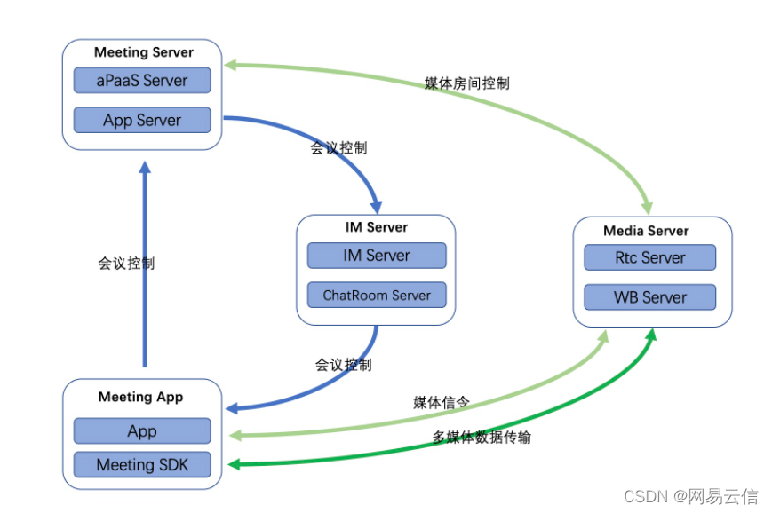 网易会议的系统设计利用了网易云信原有的 PaaS 能力, 我们通过 IM Server 来进行会控通知和多方聊天, 通过 Media Server 实现媒体数据的转发。在此基础上我们重点对会议相关特性进行了设计,包括多租户账号体系、安全入会、会议预定、会议控制、视图布局、角色控制等功能。