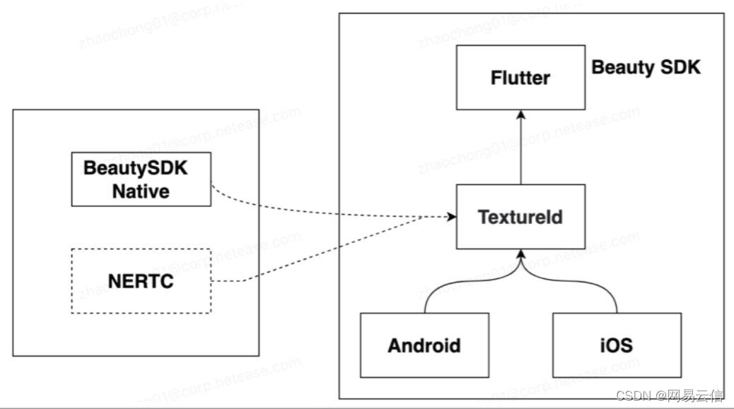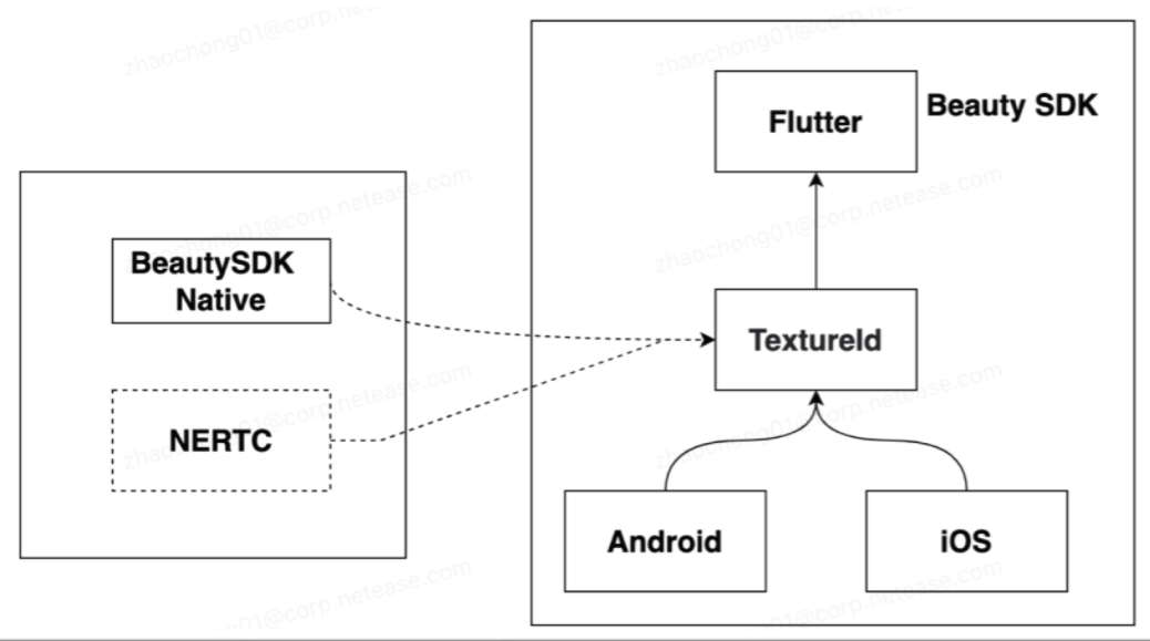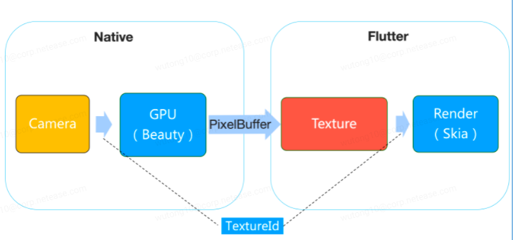 在移动端的跨平台开发中,Flutter 提供了链接原生控件的能力。比如 PlatformView,在 Android、iOS 上显示自定义的 View。也可以使用 ExternalTexture(外接纹理),开发者可以对自己的图形数据进行外部渲染。因为音视频也需要支持美颜对性能画布要求比较高,所以在设计视频渲染组件时自研了外部渲染视频插件。