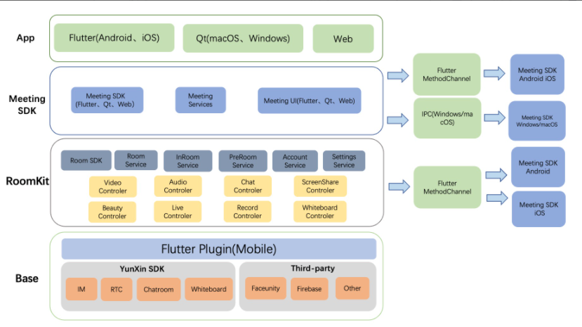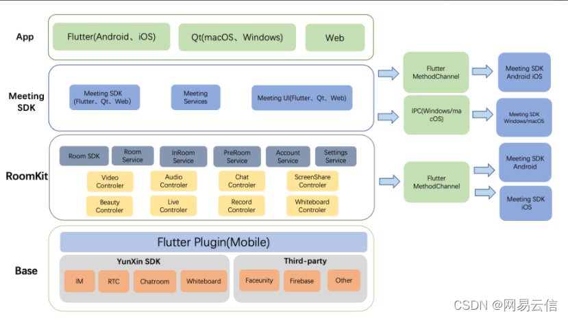 Base:这一层主要是包含网易云信的各基础 SDK,同时也会包含一些第三方 SDK。