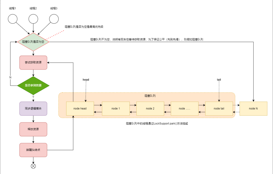 公平锁就是线程严格按照阻塞队列的排列顺序获取资源,先到先得,不得插队。如下图所示: